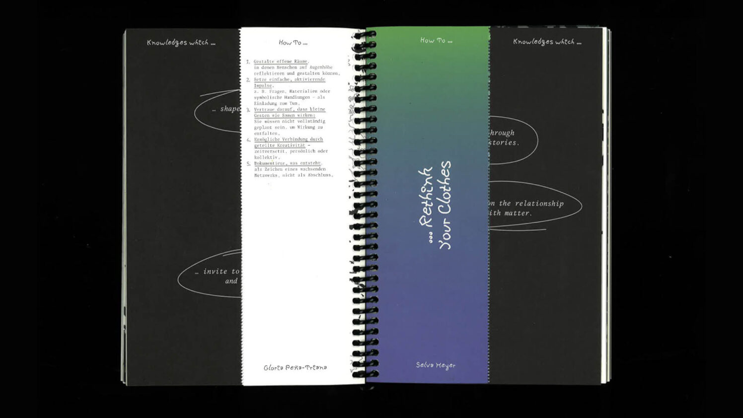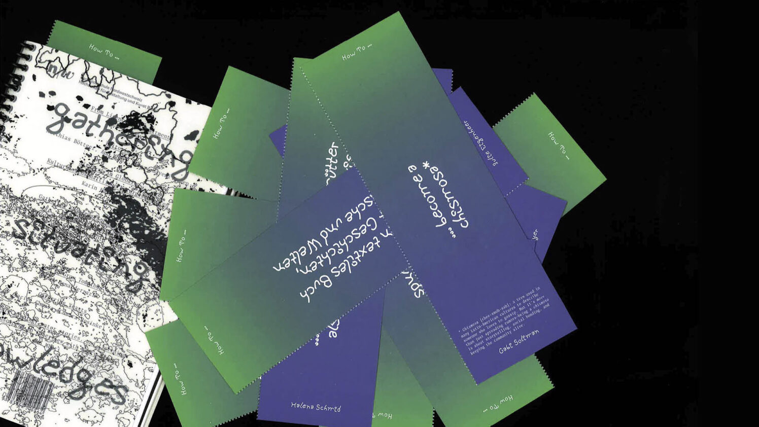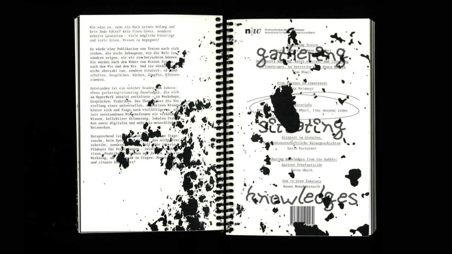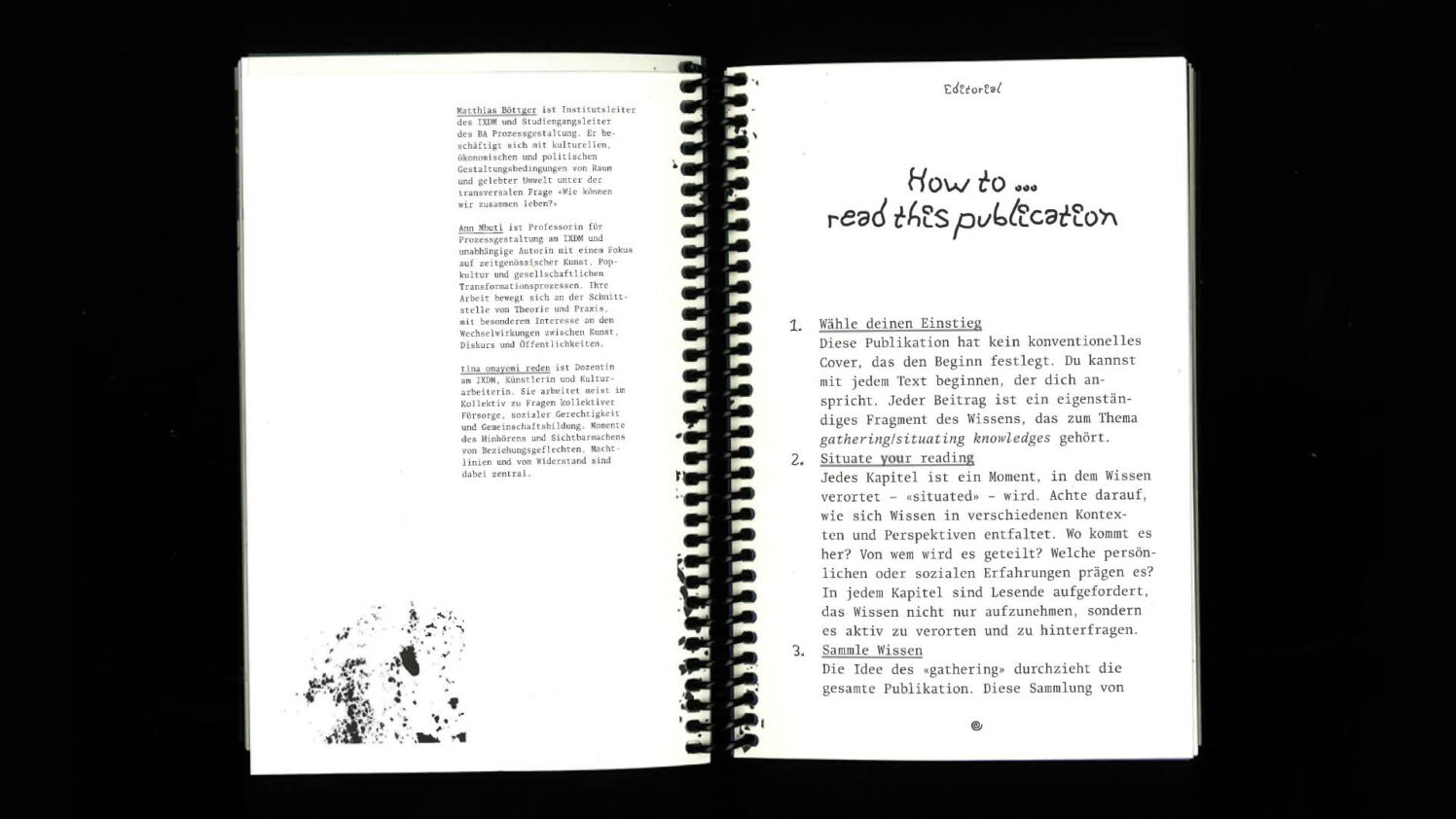 Die Publikation versteht sich nicht als klassisches Buch mit festgelegtem Anfang und Ende, sondern als offenes Format. Sie lädt dazu ein, die Lektüre individuell zu beginnen und Zusammenhänge selbst herzustellen. Jeder Text ist ein Fragment innerhalb eines grösseren Zusammenhangs und befragt, wie Wissen entsteht, geteilt und weitergegeben wird – wie es situiert ist in Landschaften, Gesprächen, Küchen, Klassenzimmern oder digitalen Netzwerken.